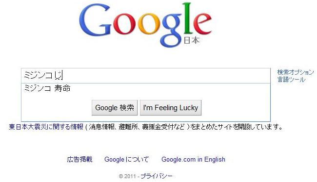 「ミジンコ じ」まで打ち込んだところ、しかも「じ」はまだ確定前でなんだか嫌な検索フレーズ候補のご登場。
