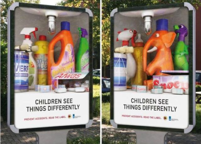 左の洗剤などが子供には右のようなオモチャに見えるのだから子供の手の届くところにこういった製品を置かないようにしましょうという啓蒙広告。