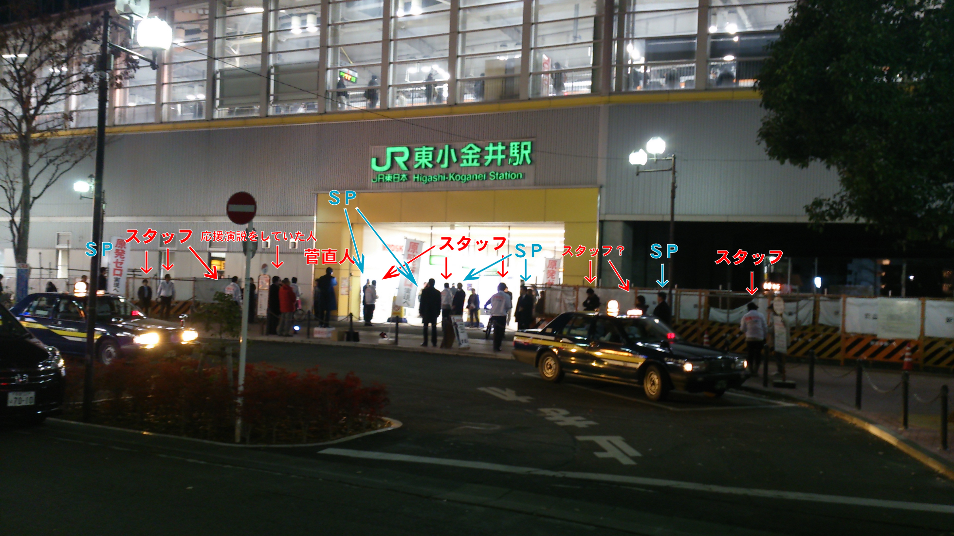先日の記事で触れた菅直人の東小金井駅前での演説の写真。これを撮っているミジンコの真横にもSPの方が1名。矢印がついていない人々が聴衆(もしくは通行人)。つまり、演説を聴いている人はほとんどいないということ。何度もこの演説の前を通り過ぎたが平均して3名ほどの通行人しか足を止めていなかった。演説が終わっても拍手がほとんど聴こえないのは聴衆から支持されていないという次元ではなく単純にスタッフしかいないからだった。