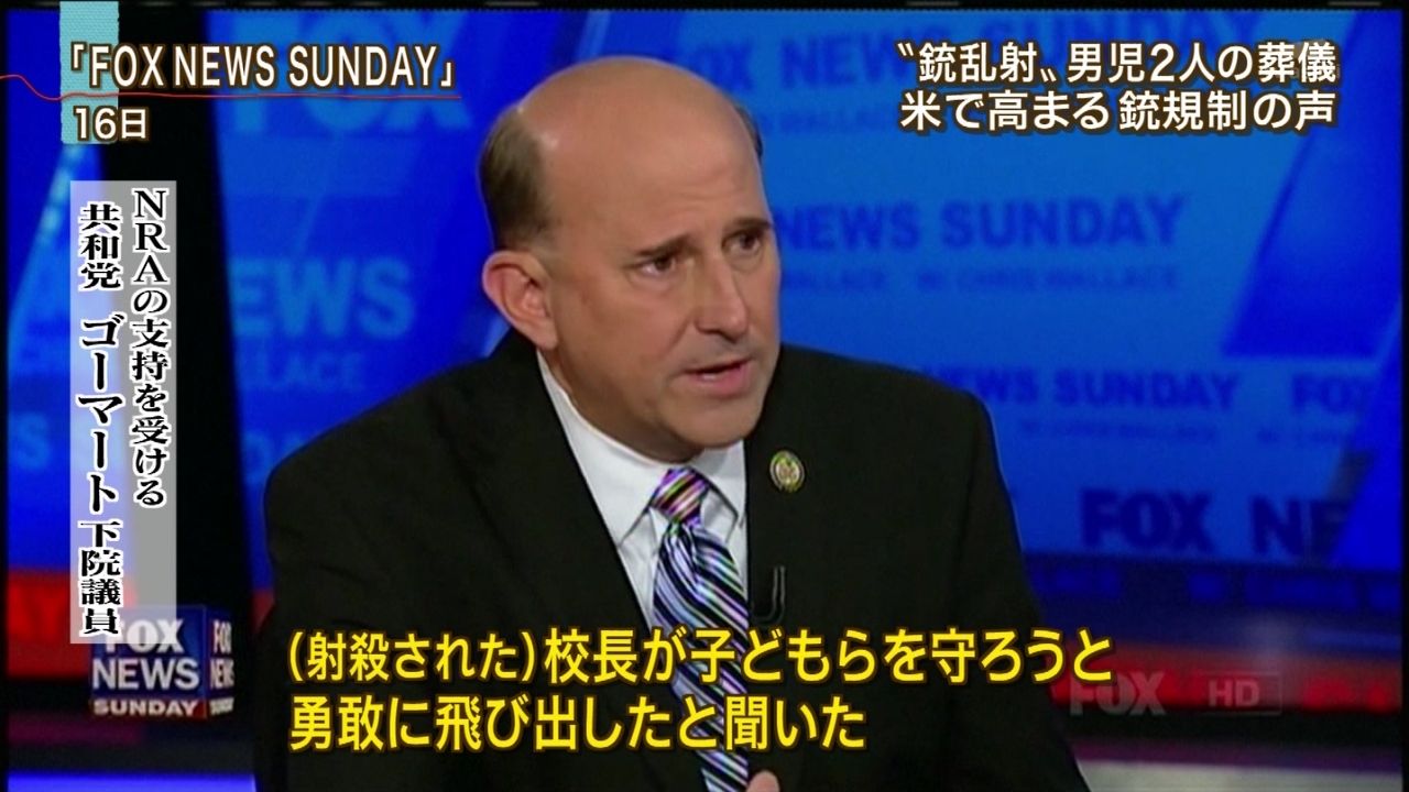 日本だとNRA(全米ライフル協会)から多額の資金援助を受けたこの画像の下院議員のようなイカレポンチはあまり知名度もないけれど、こういうNRAの族議員とも言える議員はアメリカには沢山いて本当にその顔を見ると虫唾が走る。画像はコラではないのだ。本当にこの議員はこういうことをニューステレビ番組で発言している。このクソッタレ議員は本気でこういうふざけたことを全米に向けて放送されると承知のニュース番組で言い放ったのだ。