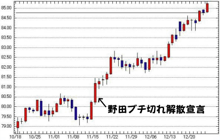 言葉で色々と語るよりも下のチャートをご覧いただければ簡単かと。この前財務大臣の言っていることが馬鹿げた言い訳であることは明らかだ。市場は安倍政権の金融・財政政策を見据えて円安に傾いたのだ。安倍政権ならば断固たる決意で円高対策に取り組むと市場は素直に感じ取ったということだ。逆に言えば民主党政権のときには円高傾向は揺るがないと市場が捉えていたということだ。