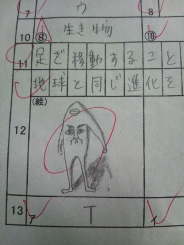 設問『あなたが想像する宇宙人の容姿と、その姿を描いた理由を説明せよ』(→絵の上の”地球と同じ進化を……”が理由かな、と)