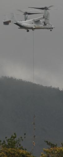 東日本大震災のときにヘリの着陸が難しい場所にさえ、自衛隊や海兵隊のヘリは果敢に離着陸を試みていた。パイロットたちの卓越した操縦技術があったればこそだ。もしこの写真のように着陸せずとも一気に大量の人員を現場に投入できれば助かる命は増えるはずだ。血液が足りない場所に賭けに出て血液だけピンポイントに落とすよりも医療チームと血液をこうやって同時に降下させることができれば状況は一変するはずだ。同時に災害救助犬を抱えたハンドラーを降下させると瓦礫の下で声も出せずにいる人々の救助が間に合うかもしれない。大量輸送ができて垂直に飛べる機体がいかに災害発生時に効果的かを次の震災のときに自分の目で見るまで信じないという人々は余りにも視野が狭い。この写真を見ただけでも将来のシュミレーションは容易なはずだ。