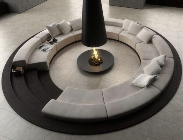 こんな感じで屋内で暖炉ではなく焚火(たきび)を設置するラグジュアリー・スペースが増えてきている。