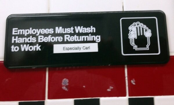 『従業員は仕事場に戻る前に必ず手を洗うこと。特にカール。』