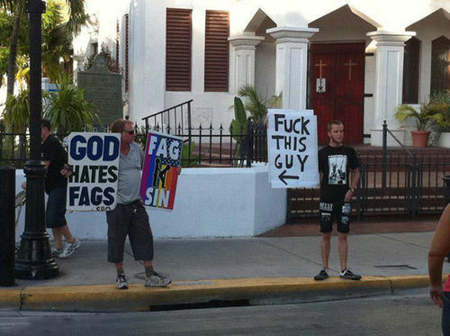 同性愛者を批判する左の男は「神は同性愛者を嫌っている」と主張している。そこへ同性愛者と思われる男が現れて反撃。差別する側は根本的に「人を殴るときは殴り返される覚悟」というものを備えていないように見える。ミジンコは無神論者だが、もし神様がいたとしても、神様が嫌うのは同性愛者をいちいちプラカードを掲げて差別するこの男の方だと思う。