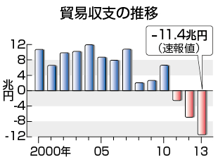 財務省が二十七日発表した二〇一三年の貿易統計(速報、通関ベース)は、輸出から輸入を差し引いた貿易収支が十一兆四千七百四十五億円の赤字だっ た。赤字額はこれまで最大だった一二年の六兆九千四百十億円から65・3%増え、過去最大を更新した。比較可能な一九七九年以降で、初めて三年連続の貿易赤字となった。対中国の貿易赤字は過去最大の五兆二百十五億円だった。