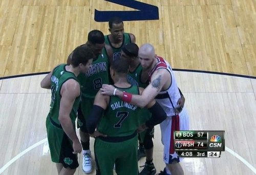 ボストン(緑)の選手の輪にワシントン(赤白)の選手が・・・・・。