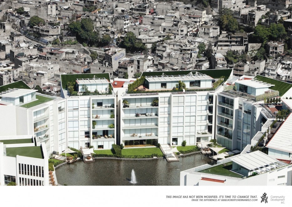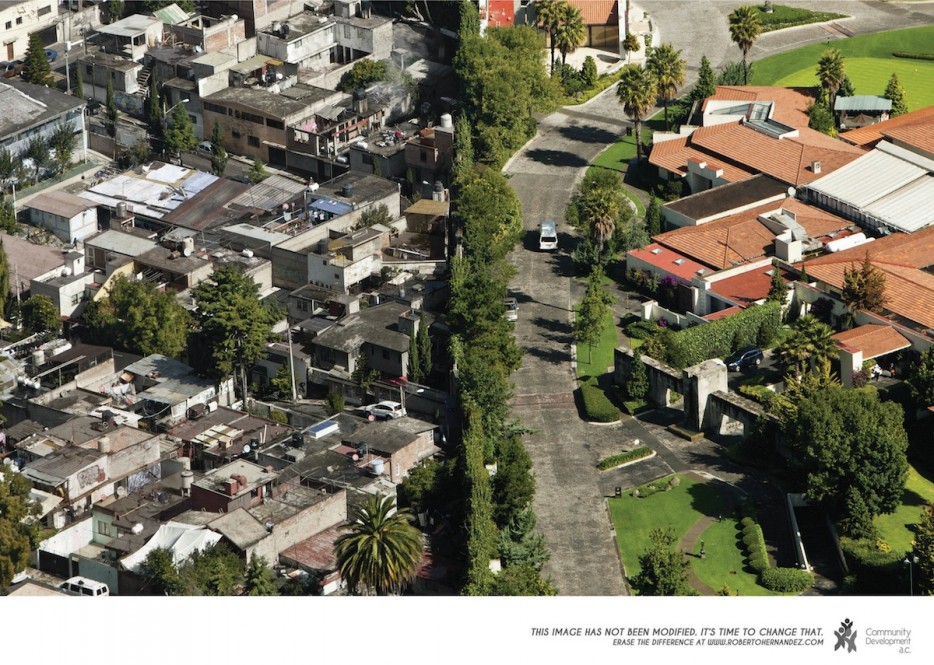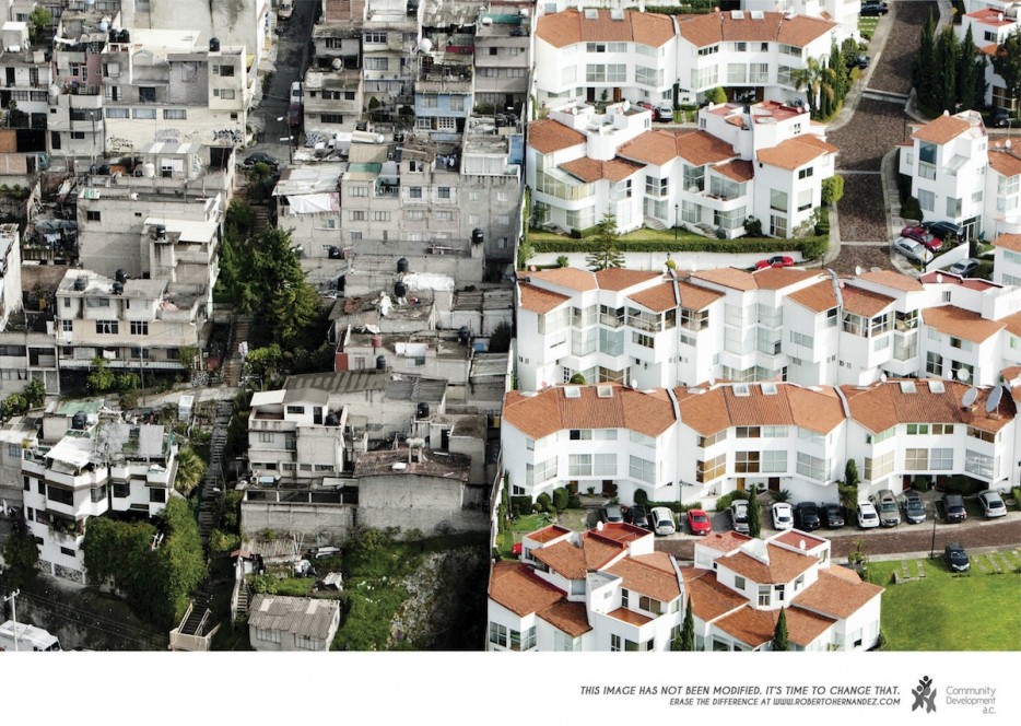メキシコ政府が行っているキャンペーン「Erase the Difference(違いを無くそう」の公共広告ポスター。写真家Oscar Ruíz氏によって撮影されたこれ等の風景がメキシコの格差社会の現状ということ。全てのポスターに「この写真は加工・修正はされていません。今こそ変える時です。」と記載されている。