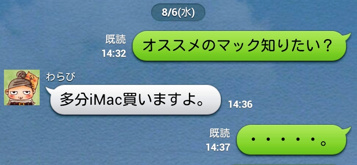 弟子がアホ過ぎて心配なのでLINEでオススメのMacを教えてやろうと連絡した。ちゃんと画像も用意しておいた。右の画像だ。なんて親切なんだ俺様!
