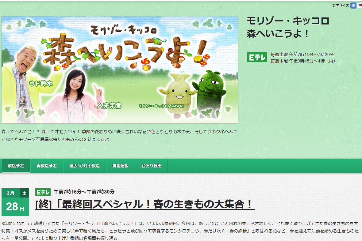 8年間の長きに渡り放送されていた「モリゾー・キッコロ 森へいこうよ!」が来週で最終回を迎える。録画予約するときに番組名横の【終】の字に我が目を疑った。絶望とはこういうことか。もう俺も森に帰る。
