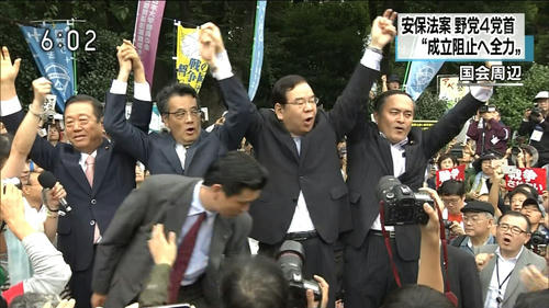 先ず、安保法制という世界的には至極当たり前の権利を日本が得ることを阻止しようとして集まっている「どこの国の利益を追求しているのか甚だ怪しい集団」のデモに野党とはいえ一応は日本の政党の党首たちが雁首揃えて応援に駆けつけるとは許しがたい暴挙だ。日本の国防強化、もっとストレートにいえば「日本が攻められ難くなる法律」の整備をここまで妨害したがっている集団といえば、それはまさに「日本が攻め易いほうが後々助かる」と考えている国家の手先たちということだ。そんな売国集団の卑劣なデモに野党4党がこうやって支援の意思を表明しているのだ。どいつもこいつも日本の敵ばかりだ。