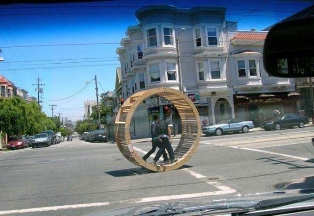 実際のところは、制作途中の大太鼓か何かを転がして運んでいる人?