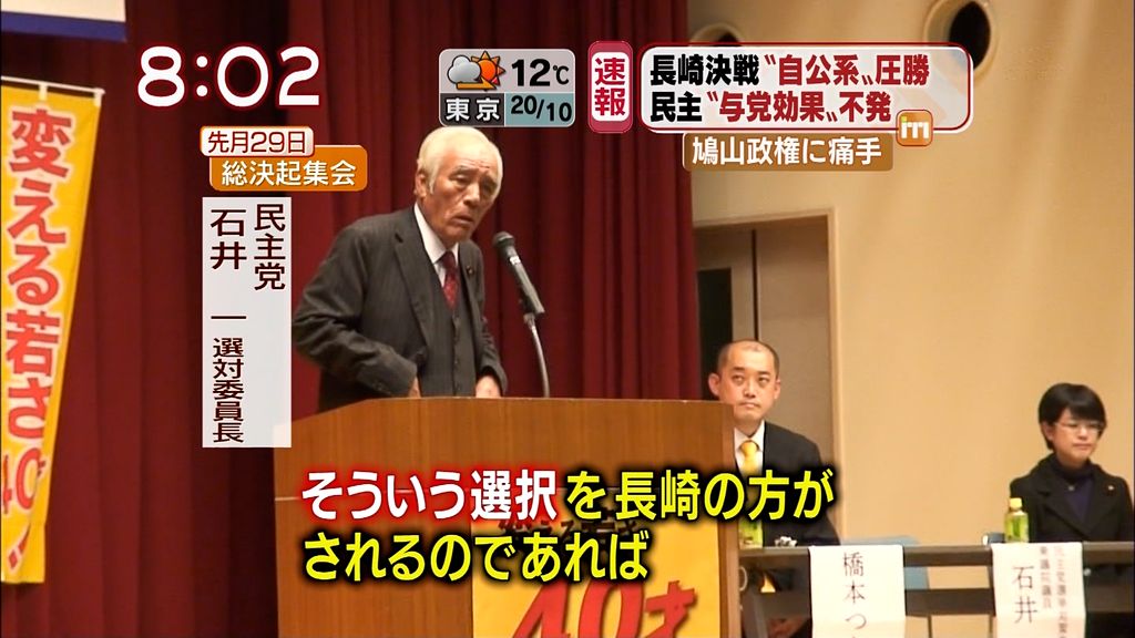長崎県知事選を受けての民主党総決起集会での石井一選挙対策委員長の発言。