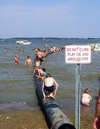 「バイプに乗ったり、パイプで遊んだり、パイプの周囲での遊泳は禁止です。」