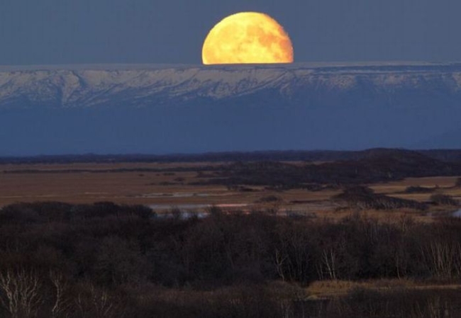 私には月の出に見えるんですが。。。。 夕方、東の空から昇ってくる満月に。