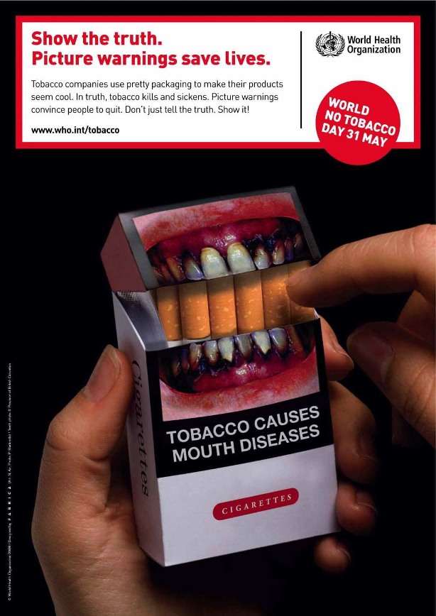 タバコ企業は製品パッケージをお洒落で洗練された印象を消費者に与えるデザインを施しているが、実際にはタバコは癌や様々な疾患の原因となるものであり、決してカッコイイものではないと世界禁煙デーの主催団体は訴えた。
