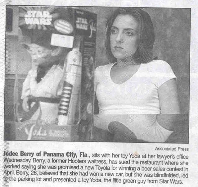 Hooters(ウエイトレスに露出の多い制服を着させる大手レストランチェーン)での「ビール売上コンテスト」にて「優勝者には新型トヨタ車を贈呈する」と約束していた店側が、優勝した元ウエイトレスのベリーさんに贈ったものはオモチャ(Toy)のヨーダ(Yoda)― あのスターウォーズに出てくる緑のちっこいヤツ ― であった。ベリーさんはてっきり新車を貰えるものと思い、駐車場の契約までしていたというのに!