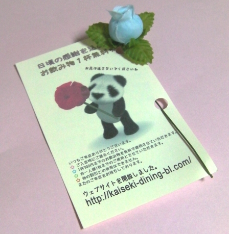 これはそのカツオくん、もといパンダさんの店で配布中の「1杯無料券」。カードにバラの花が付いてくる。たぶんパンダさんがこのカードをお客様にお渡しするときに“大爆笑トーク”をしてくれると思うので皆さん乞うご期待!(←コレを読んだカツオくんは悶絶中と見た。)