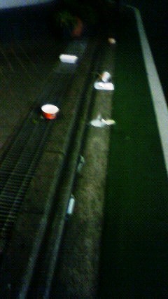 祭りが終了後も数時間に渡って、お世辞にもガラが良いとは言えない若者たちが駅周辺で延々と地べたに座って奇声を上げたり酒を飲んだりタバコをふかしたり。祭りの主催者側の掃除部隊もさすがに夜中には撤収しており、ポイ捨てされるゴミは増える一方。左の写真のは祭りの開催地から1本隣りの道での光景。夜中にたむろっていた者たちが外でカップ麺などを食べてそのまま容器などを置いて去っていったのだ。最初はミジンコも走りながら拾っては購入店であろうコンビニのゴミ箱に捨てていたがまるでイタチゴッコでどうにもならなかった。数百人からなるポイ捨て軍団は数時間に渡ってゴミをポイ捨てし続けていたのだから。
