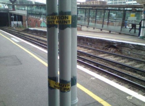 先に「ペンキ塗りたて注意」のテープを貼ったと思われる。