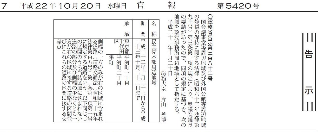 つまり民主党本部周辺でのデモは「静穏の保持に関する法律」とやらで先月の23日から来年の10月22日までの間は不可能となったということ。もしデモをやったら逮捕される可能性大。