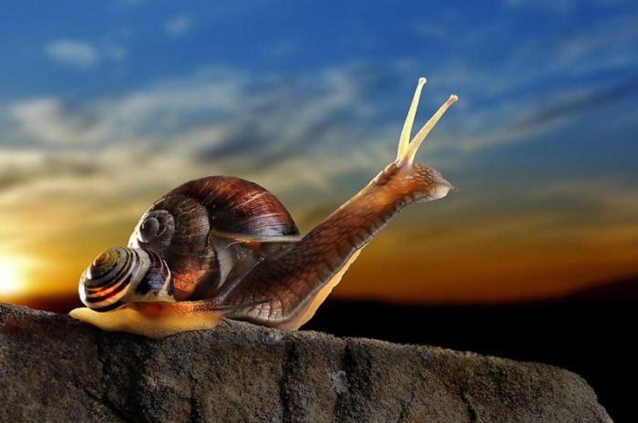 日本の夜明けを見守るカタツムリ親子