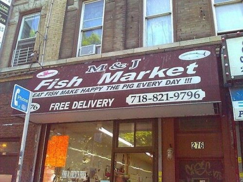 EAT FISH(魚を食べよう) MAKE HAPPY(幸せになろう?) THE PIG(豚) EVERY DAY!!!(毎日!!!)