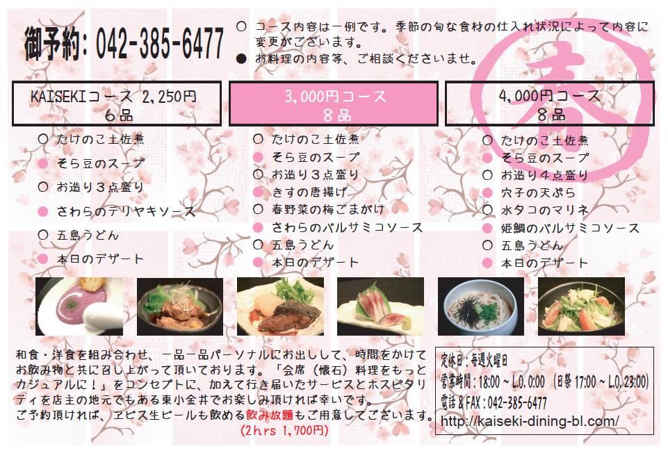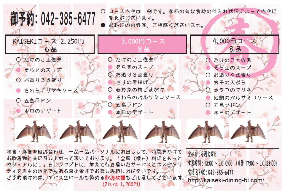 東小金井の会席ダイニングのお店の会席コース紹介のリーフレット。季節ごとにミジンコが勝手に作っている。