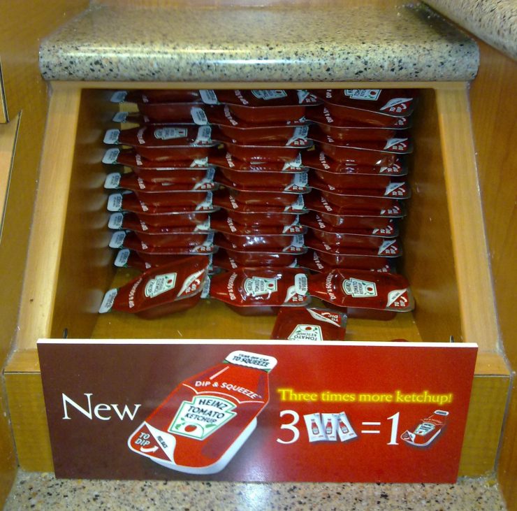 そしてその何十年と定番だったケチャップパックの量が3倍タイプの登場。ケチャップって何気に砂糖を結構使用しているというのに、まったくアメリカってやつは・・・・・。