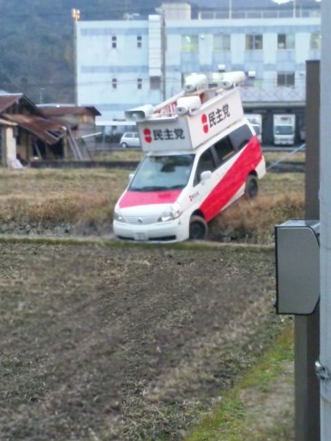 もっとリアリティーを求めるならば、ドライバー(首相)とナビ(幹事長)がフロントガラスを突き破って田んぼに刺さっている状況かと。