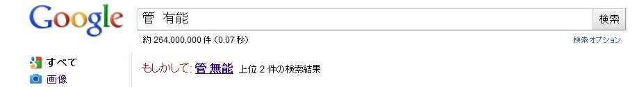 「菅 有能」でググると「もしかして」の候補に「菅 無能」が挙げられる。菅直人についていかに「無能」というキーワードで検索されているのかが窺える。