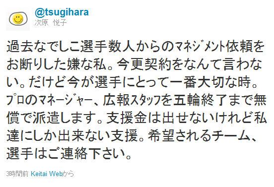 サニーサイドアップ・次原社長のなでしこジャパンに向けてのツイート