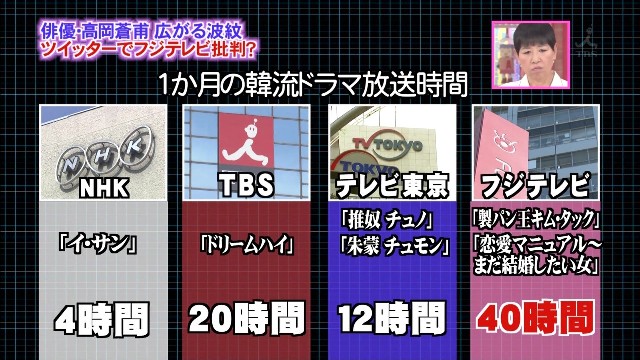 韓流ゴリ押しと、再放送でも出演者(正確には所属事務所)へギャラが発生する国内のドラマよりも放送するときのコストが安いということ、そして最近やっと取り沙汰されている外国人株主の存在など、理由はひとつではないのだろうがはっきりしていることがひとつある。1週間で40時間もの特定の1国(韓国)のドラマを放送することは公共の電波を使う放送局としては異常事態だということ。日本の放送局が特定国のPR活動に専念している。これは由々しきことだ。