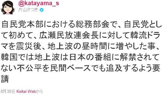 自民党本部における総務部会で、自民党として初めて、広瀬民放連会長に対して韓流ドラマを震災後、地上波の昼時間に増やした事、韓国では地上波は日本の番組に解禁されてない不公平を民間ベースでも追及するよう要請