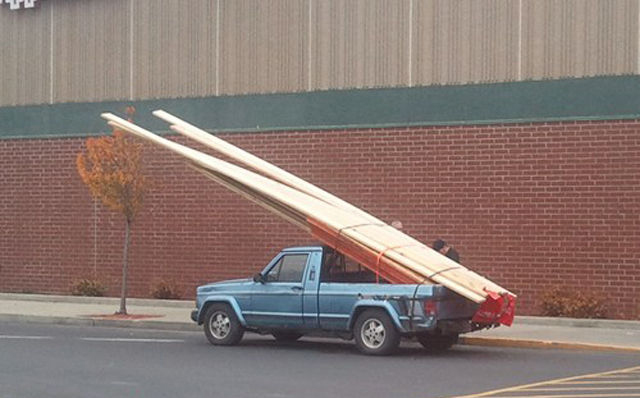 一見、長い木材を運ぶトラック