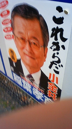 右の写真は今回ではなく前回の市長選のポスター。3期12年もの任期中にゴミ処理場を建設できなかった稲葉元市長。そんな市長の12年後に出たキャッチコピーが「これからだ小金井」、さすがに市民も萎えた。
