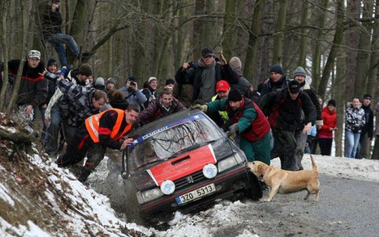 ラリーの場合、沿道の人々がスタックした車両を助けることはよくあること。でも犬は初めて見たw