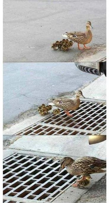 よく見かけるカルガモ親子のかわいそうな画像。