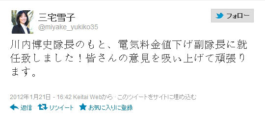 で、この三宅雪子をはじめとするアホ議員たちは、電気料金の値下げどころか今までなんのマニフェスト実現にも貢献していない上に無駄に議員給与を食いつぶし、特にこの三宅雪子に関してはあの国会スライディング事件ならびに車イス姿などで国民と国会を侮辱したわけなのだが、それでも電気料金の値下げが一定期間内でも実現しなかった場合のペナルティーはなし?ガソリン値下げ隊はただの一人も責任を取っていないどころか「そうでしたっけ?フフフ」なんてほざいた馬鹿議員もいた。本当に電気料金値下げ隊なんてものを作って活動して国民が期待するとでも思っているのだろうか?人気取りができるとでも思っているのだろうか?国民を舐めるのもいい加減にしろっての!