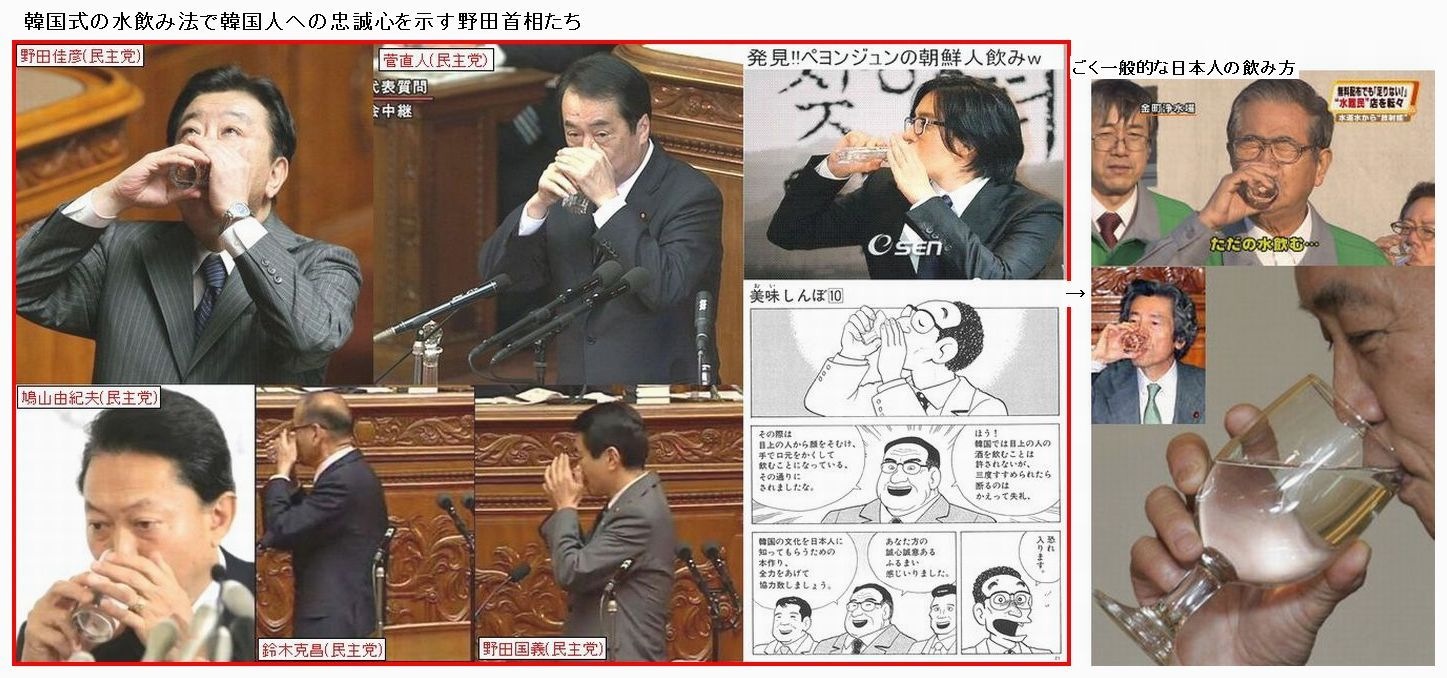 野田佳彦の水の飲み方は前々から話題になっていた。こうやって改めて他の民主党議員たちの飲み方を見るにその違和感たるや酷いものだ。水くらいグイっといけよ!