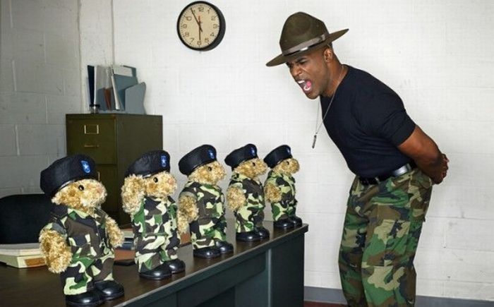 敬礼しているヌイグルミが放送禁止用語を含む言葉で怒られている光景。