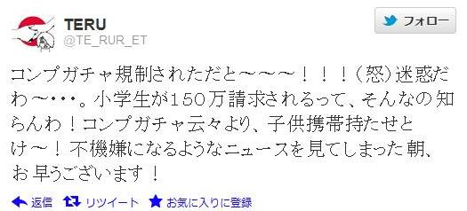 いやはや、こういう痛い大人にはなりたくないものだ。社会悪とも言える携帯ゲームのコンプガチャを規制することは当然、いや必然のことだろう。今まで放置されていたことの方がどうかしている。それを「迷惑だ!」とツイートできてしまう大人ってなんなんだろう?