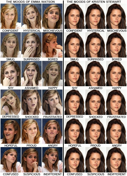 しかし愛嬌のあるエマ・ワトソンに対して、クリステン・スチュワートはインタビュワー泣かせで有名。とにかくいつもブスッとしている。インタビューのときも作品中でも「The 無表情」として有名になってしまったクリステン・スチュワートを皮肉ってネットで広められている画像がコレ。
