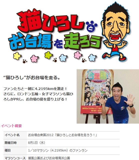 フジテレビの視聴率が悲惨なくらい下がり続けているらしい。まさに自業自得だろう。そんなフジテレビが主催する「お台場合衆国」の企画がコレ。今もって猫ひろしを持ち上げているフジテレビって馬鹿なのアホなの死ぬの?