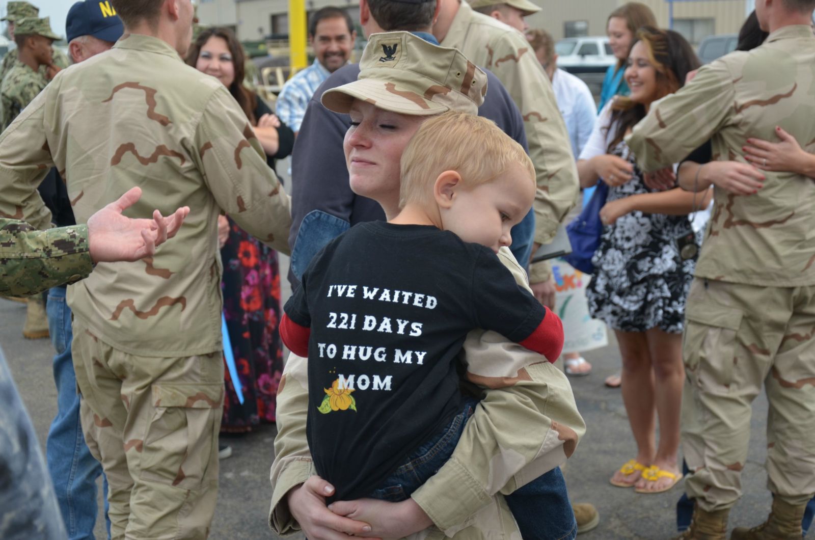 子供の背中には「ママを抱きしめるのを221日間待っていたよ」と書いてある。