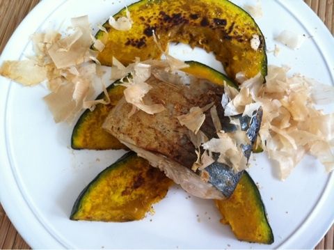 半死半生状態のボロボロのカボチャの切り身が3つ。その上に生焼けにも見えるサバ一切れ。とりあえず撒いておけ的な鰹節。サバにカツオをかけてどちらの味を強調したいというのか?