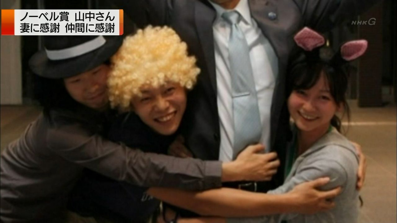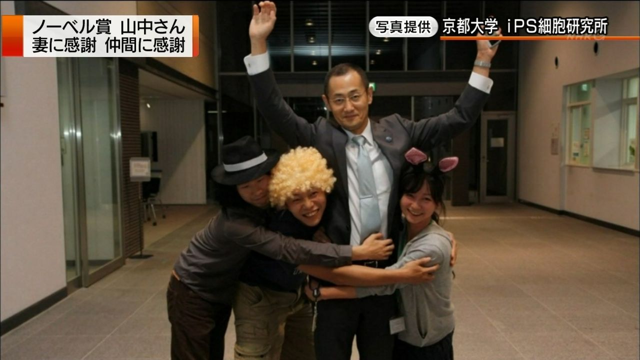写真は研究員たちが仮装して山中教授をお祝いしたときに撮った1枚とのこと。研究員たちからいかに慕われているのかが伺える素敵な1枚となっている。