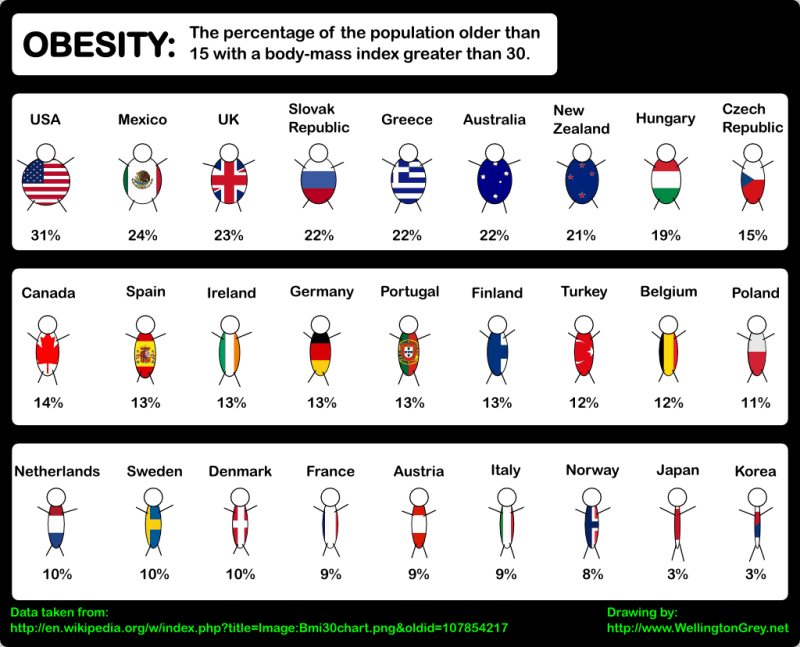 15歳以上のBMI値(肥満の指標)が30を超えている人の割合。ここでもアメリカはダントツの1位。