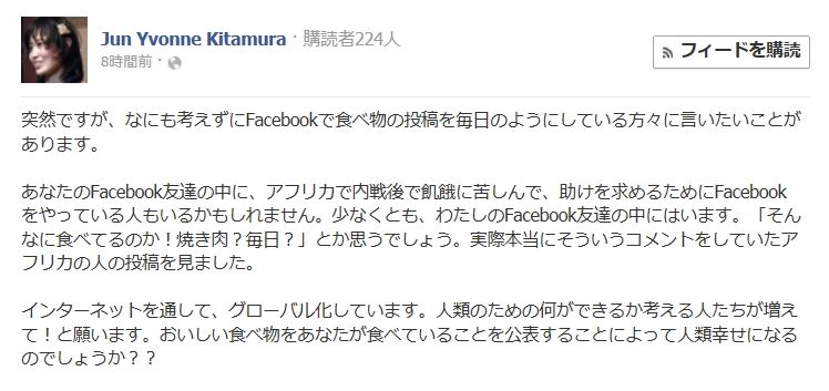 はっきり言おう。たぶんこの北村さんには通じないのだろうが言っておこう。実際は「気持ち」や「言葉」ではアフリカの現状は救えないし、そもそも他所の国の人間が救う義理もない。アフリカ人がアフリカ人の不正を正し、教育水準を上げることがアフリカの様々な問題を解決する突破口だ。つまり、「アフリカ人にちゃんとしろ!」と言うべきことがもっとも効果的なアフリカ支援だ。facebookへステーキの画像を掲載することに配慮すべきか云々の話はアフリカにとってはどうでもいい話だ。むしろ訴えかけていることが馬鹿馬鹿し過ぎてブラックジョークの類いにしか受け取られないことだろう。